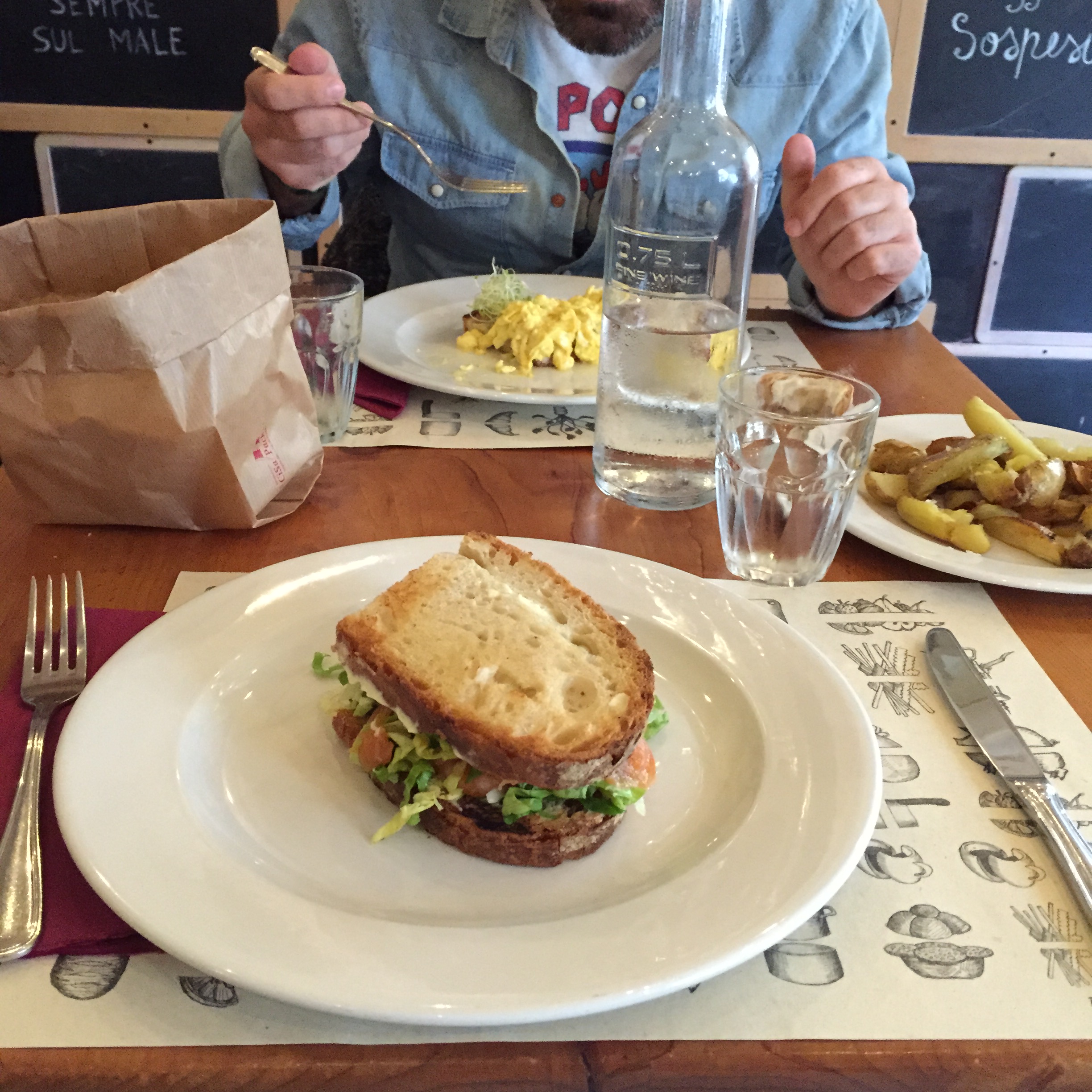 R. ha preso uova strapazzate e una crema di fave bio (squisita) con cicoria stufata, mentre io (ovviamente) salmone. Addirittura ho preso il sandwich, che io non prendo MAI perché non sono capace a mangiare. Eh oh.